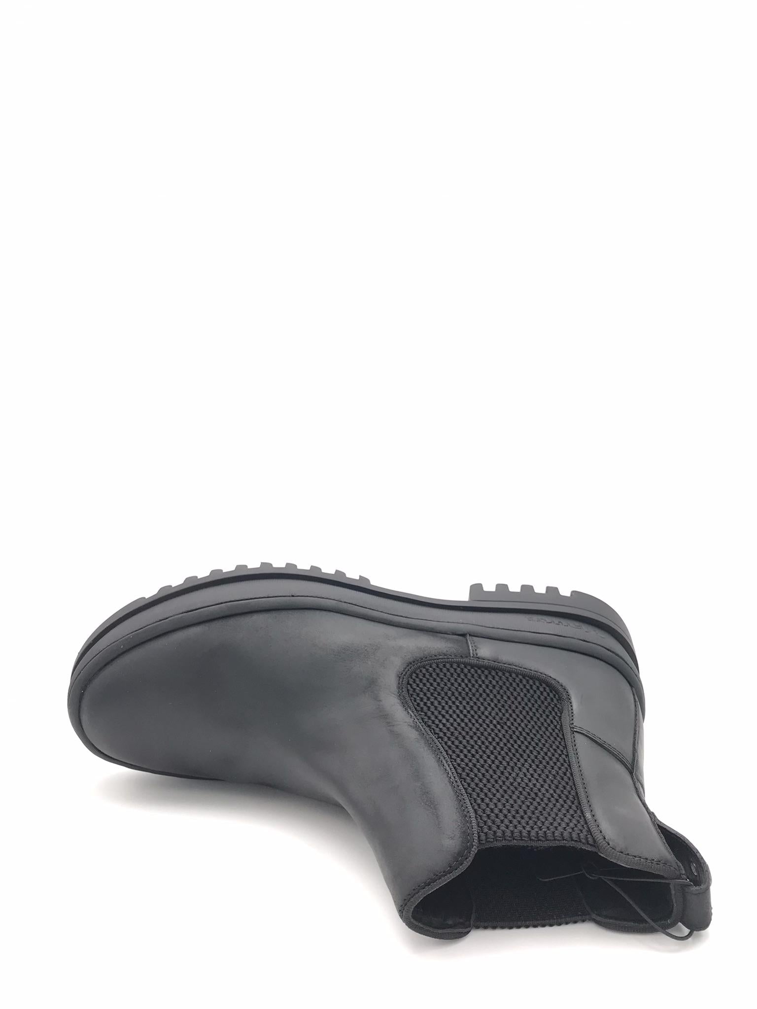 Chelsea boot realizzato in pelle ingrassata nera. Elastici laterali. Forma arrotondata. Fodera interna in pelle. Suola in gomma cucita nella tomaia.