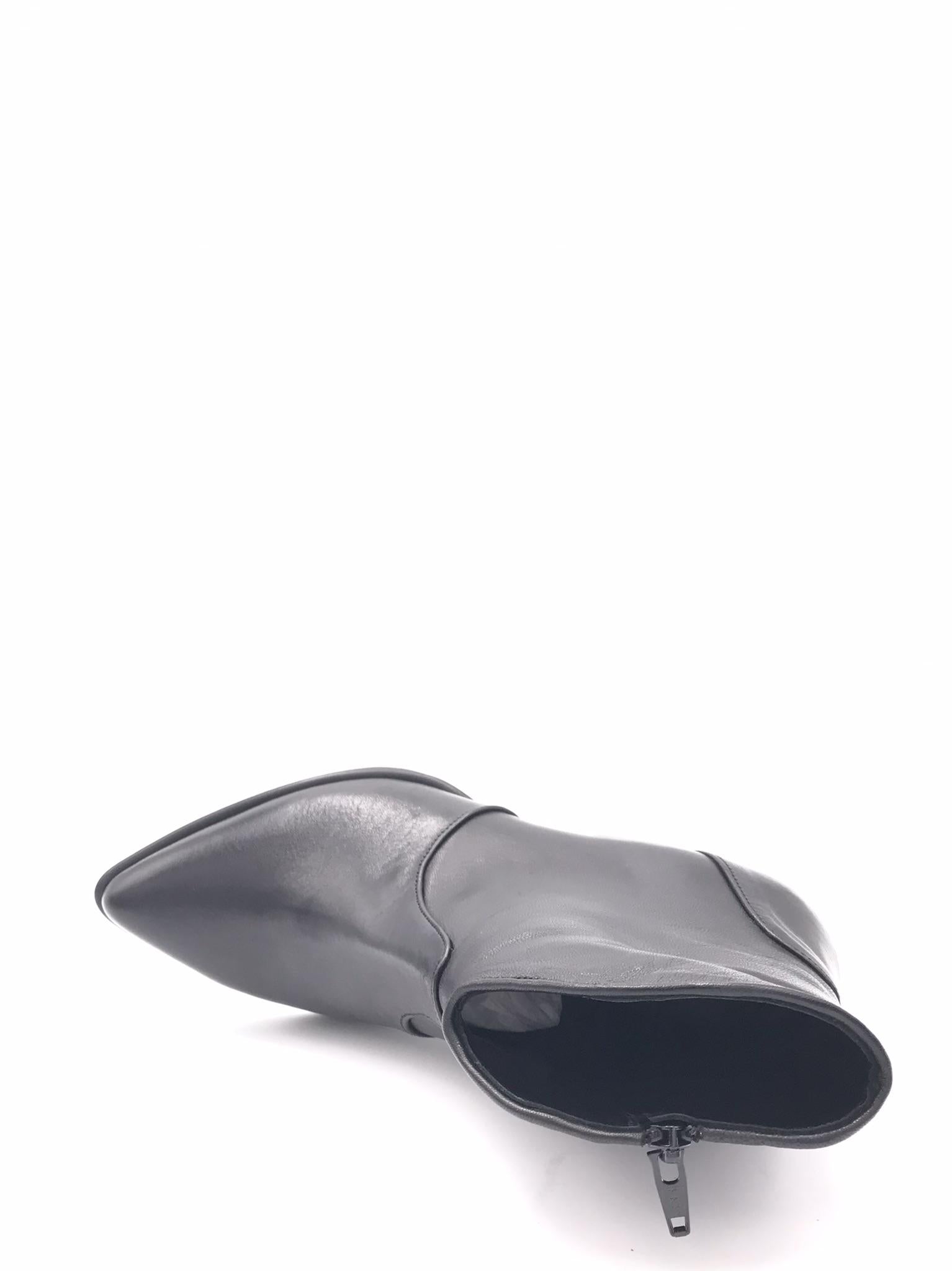 Tronchetto texano realizzato in morbida pelle nera. Forma sfilata. Tomaia con finale irregolare nella caviglia. Fodera interna in pelle. Zip interna di chiusura. Sottopiede morbido in pelle. Tacco largo foderato in tono colore altezza 4 cm. Suola in gomma con guardolo in pelle.