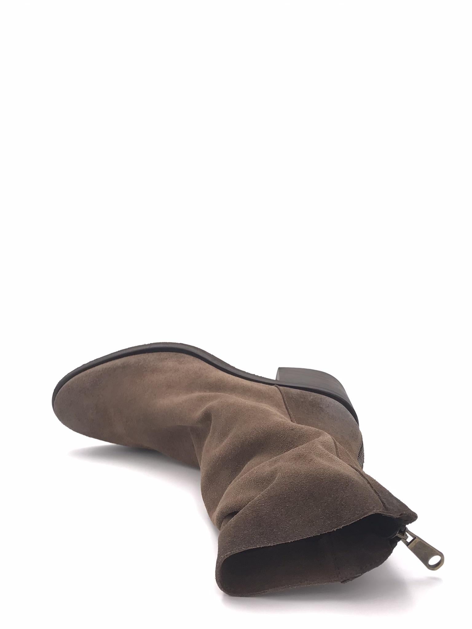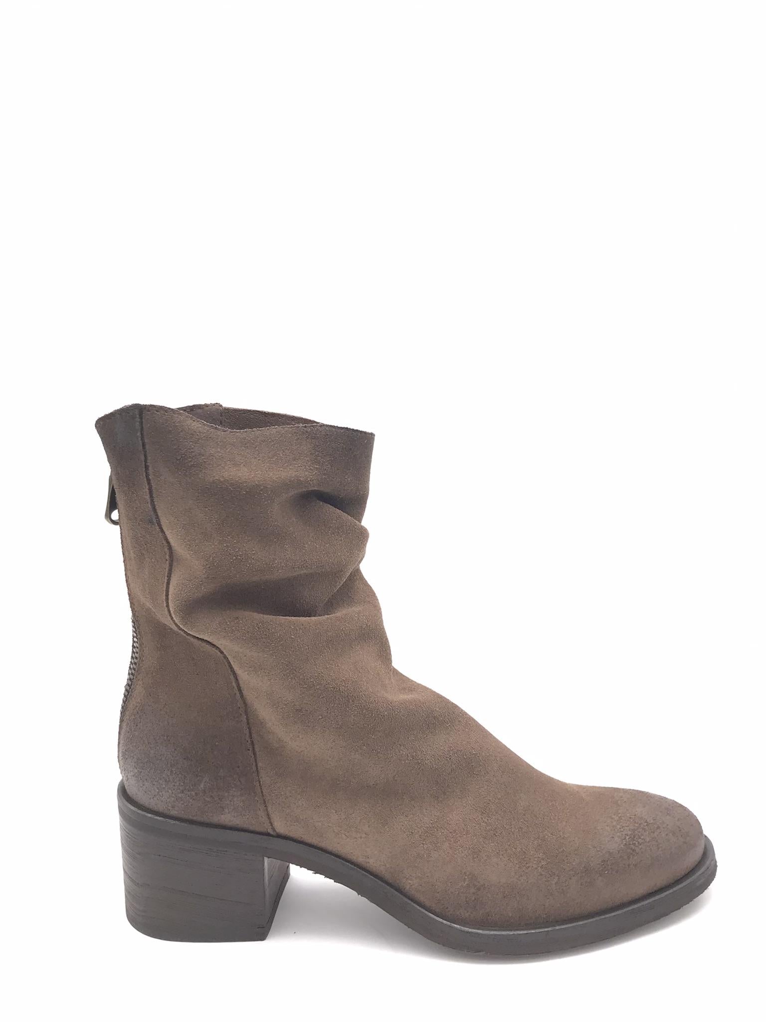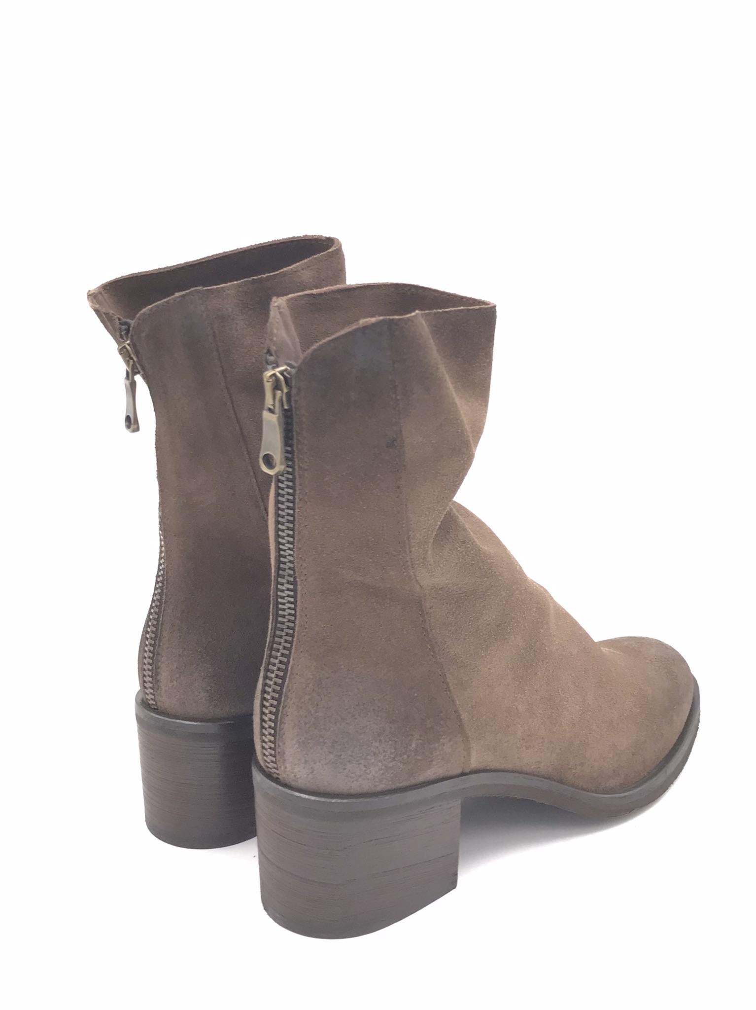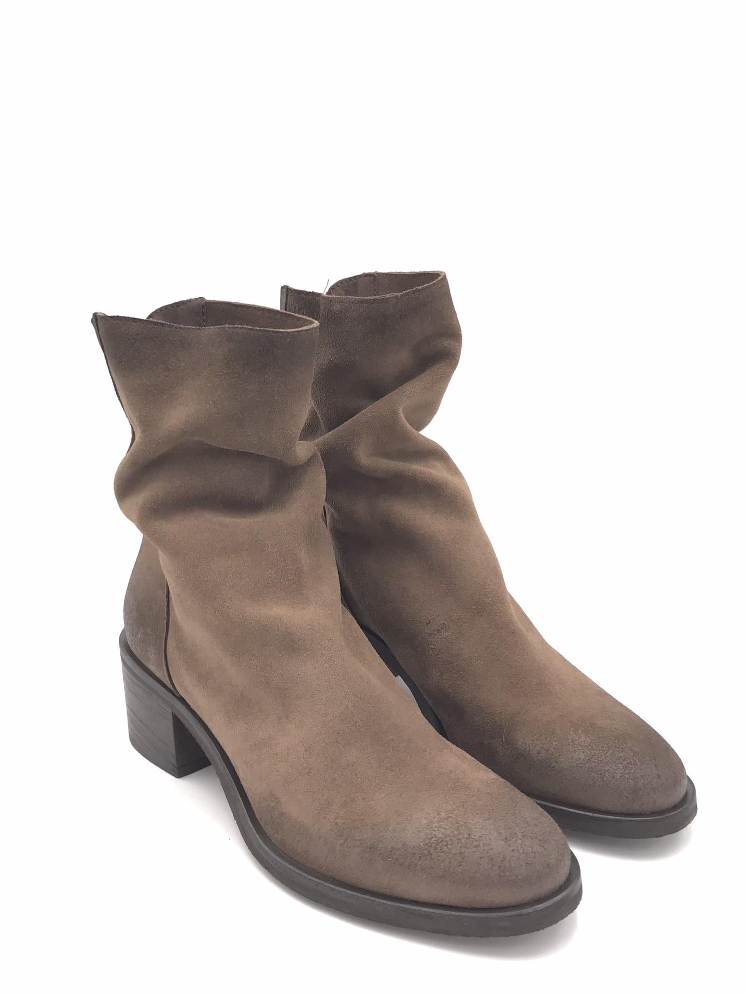 Tronchetto realizzato in morbida crosta color fango. Tomaia arricciata nel collo piede. Chiusura con zip nel tallone. Forma arrotondata. Fodera interna in pelle. Suola in gomma con tacco grezzo altezza 5 cm. Lavorazione artigianale