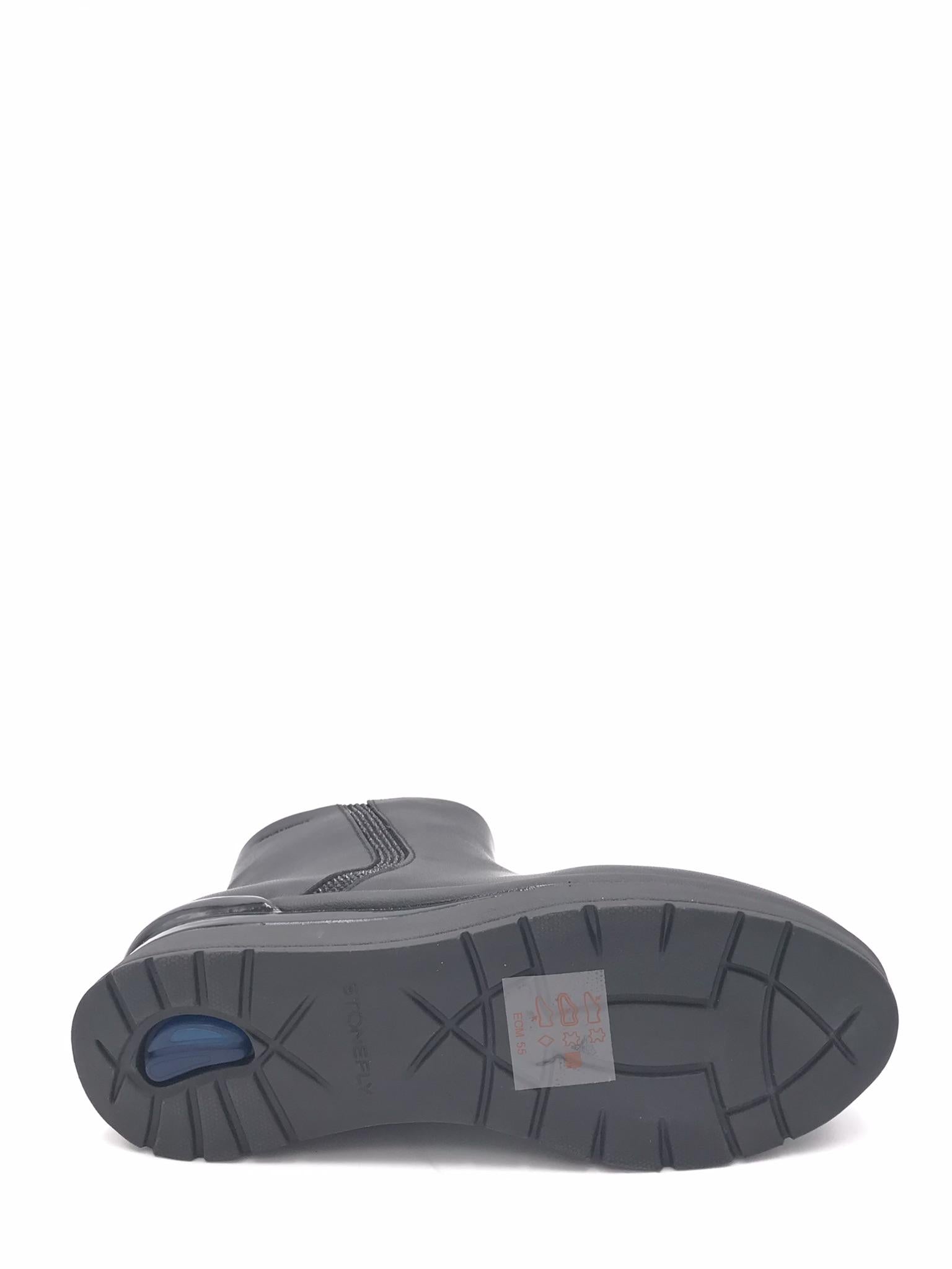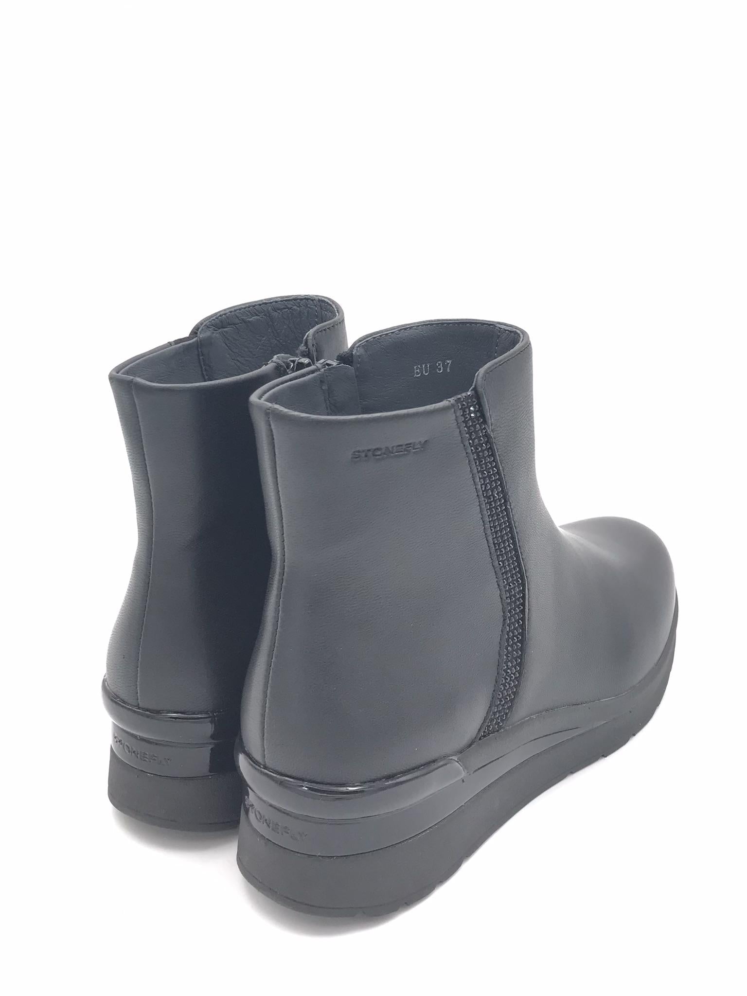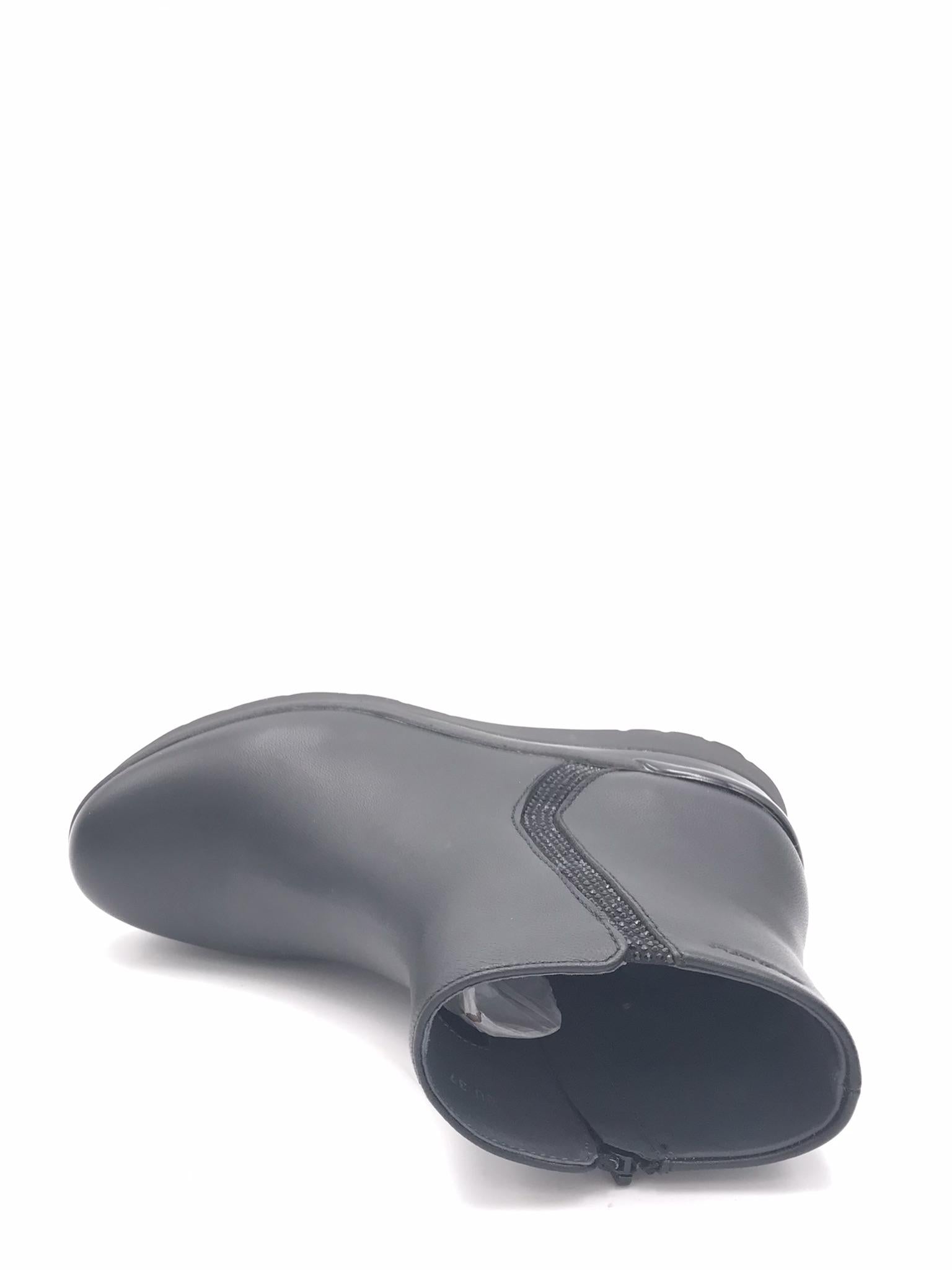 Tronchetto in morbida pelle nera con dettaglio di strass in tinta aplicati. Fodera interna in pelle e tessuto elasticizzato. Zip di chiusura. Sottopiede morbido in pelle e lattice estraibile. Suola in gomma altezza tacco 3 cm con inserto in gel Blusoft che ammortizza la camminata.