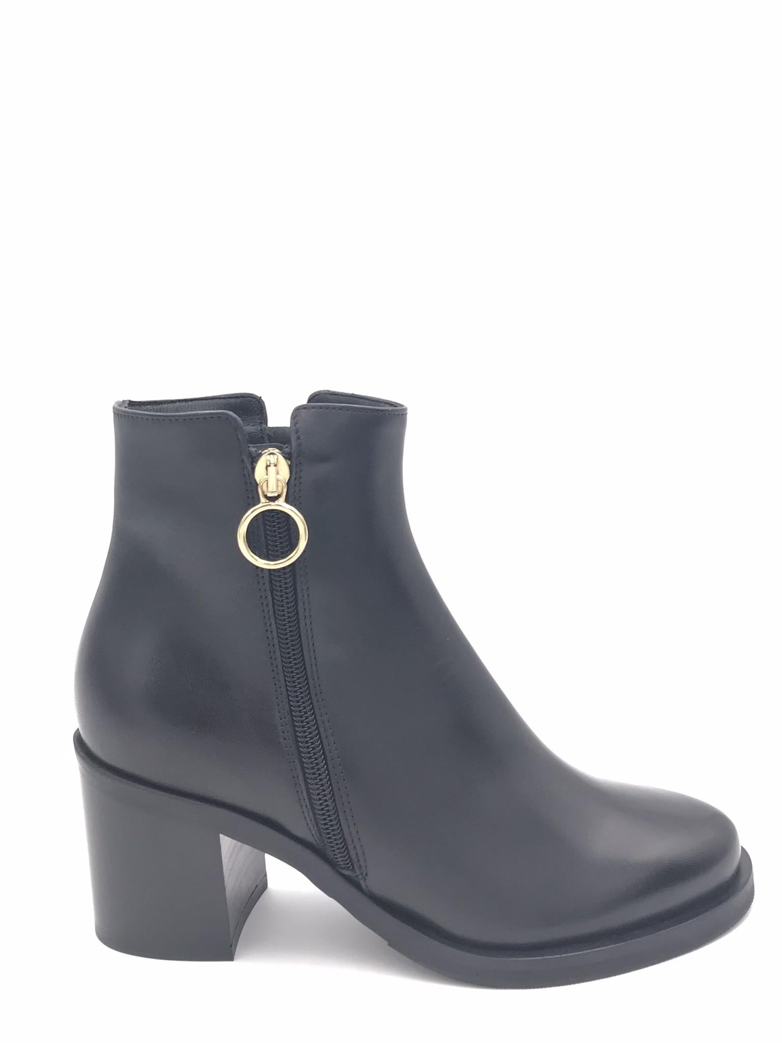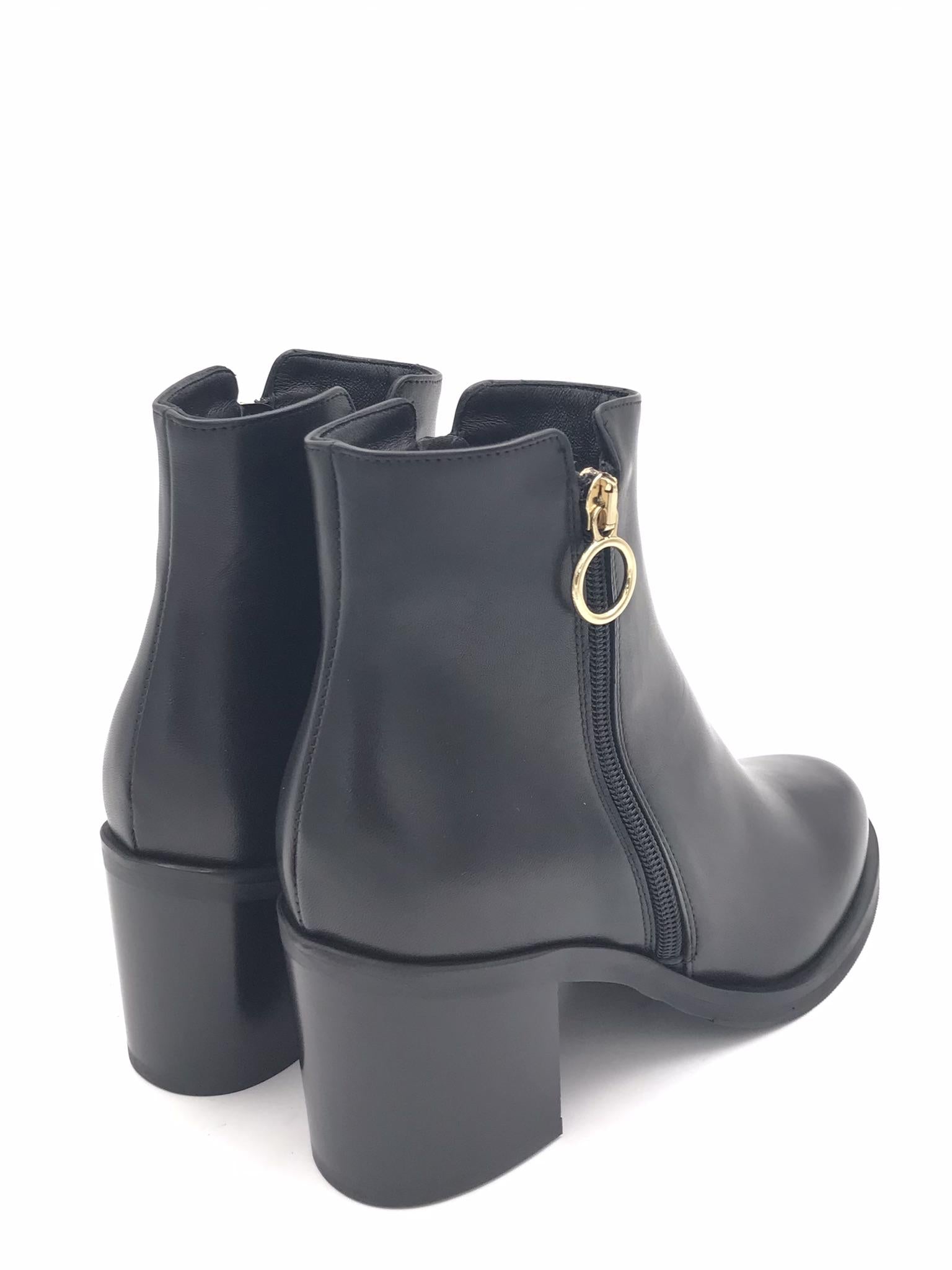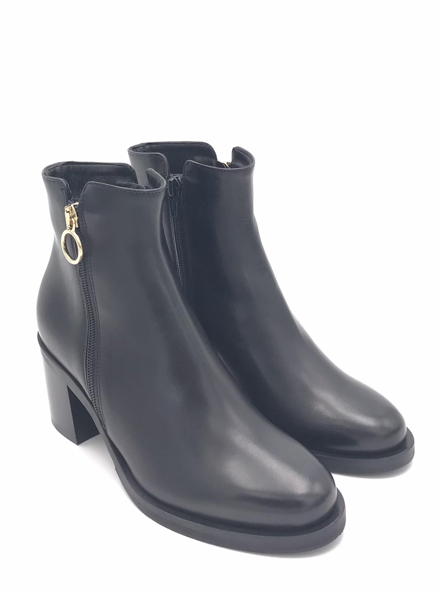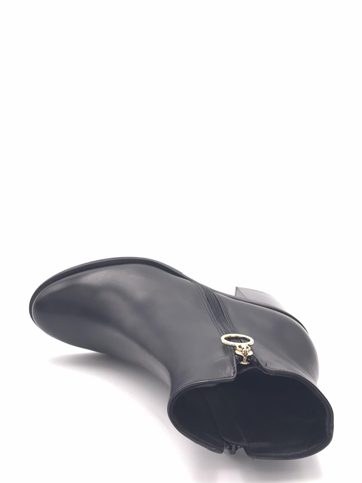Tronchetto dalla linea elegante in nappa nera. Forma arrotondata. Doppia zip laterale. Fodera interna in pelle. Tacco altezza 6 cm con suola in gomma. Lavorazione artigianale