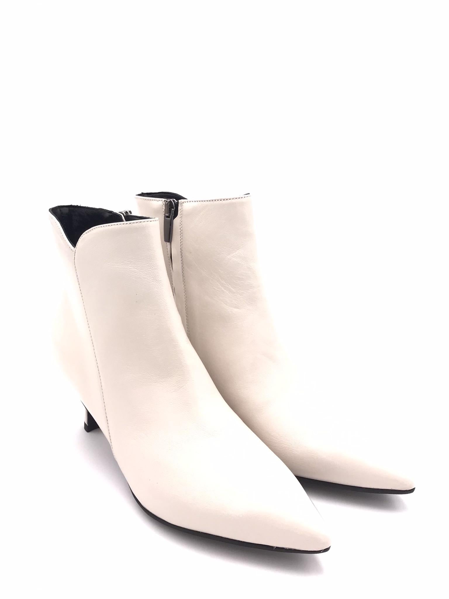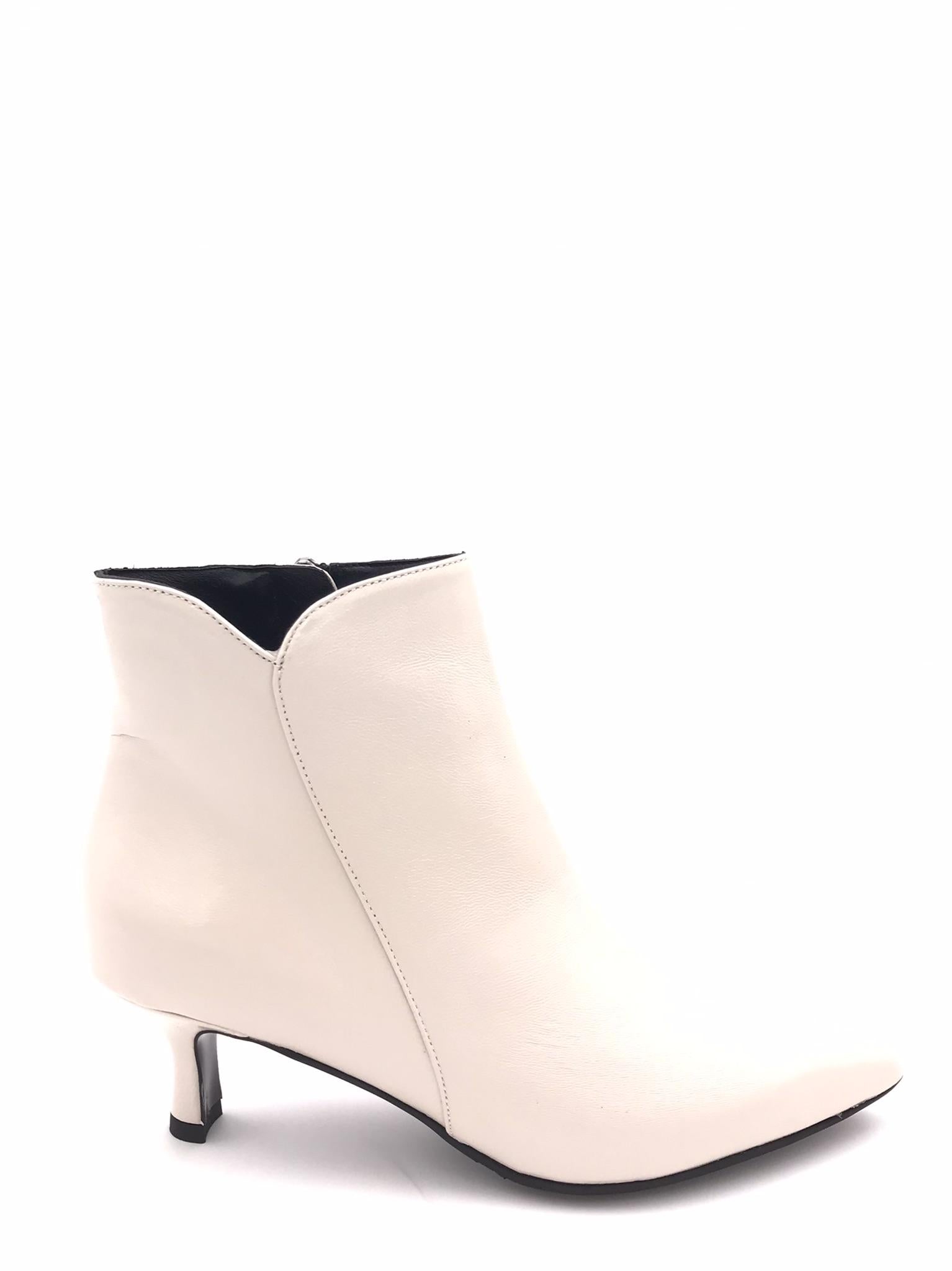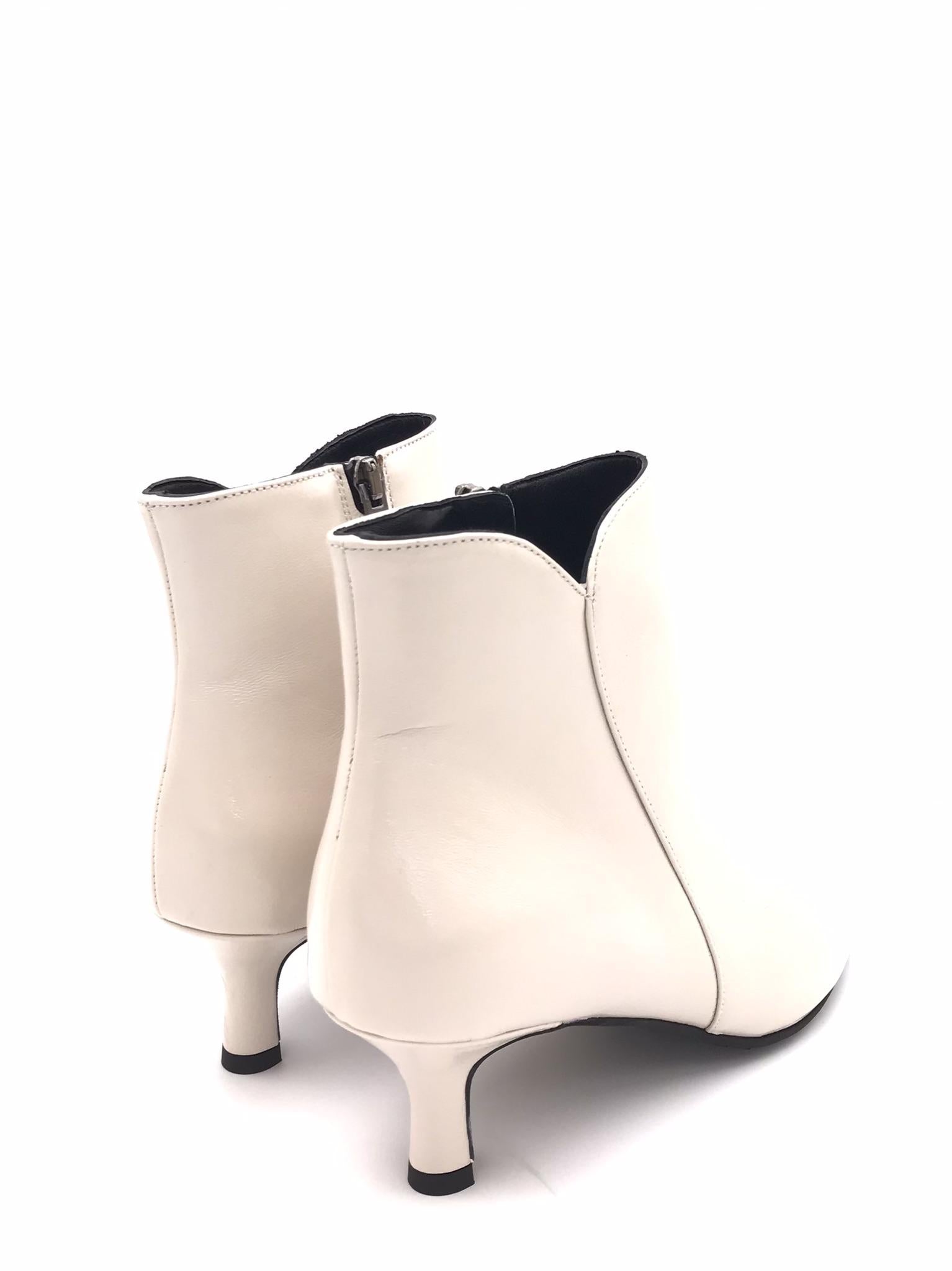 Tronchetto in nappa morbida nappa verniciata color burro. Forma sfilata. Fodera interna in pelle. Chiusura con zip laterale interna. Sottopiede morbido con lavorazione sacchetto. Tacco foderato in tono colore altezza 5 cm. Suola in gomma.