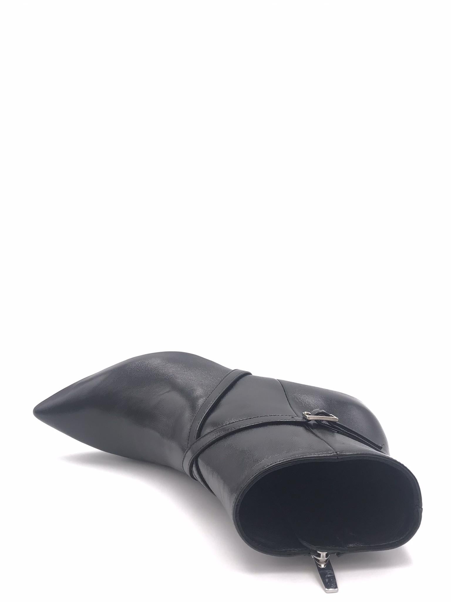 Tronchetto in nappa morbida nappa verniciata color nero. Cinturini applicati nela tomaia. Forma sfilata. Fodera interna in pelle. Chiusura con zip laterale interna. Sottopiede morbido con lavorazione sacchetto. Tacco foderato in tono colore altezza 5 cm. Suola in gomma.